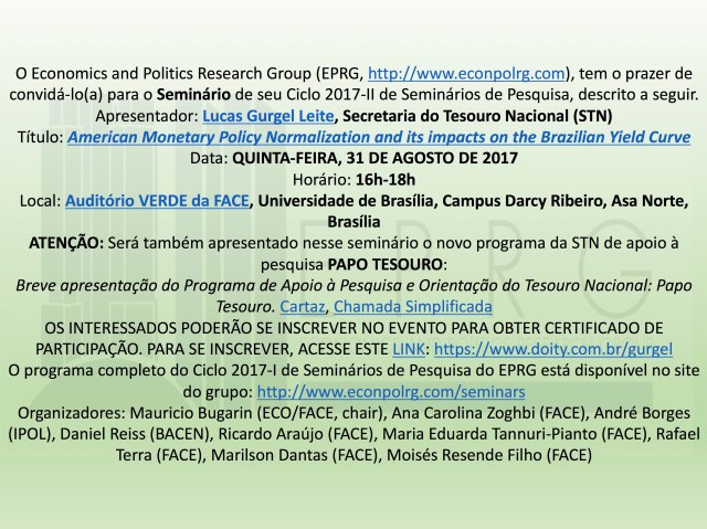 O Economics and Politics Research Group (EPRG, http://www.econpolrg.com), tem o prazer de convidá-lo(a) para o Seminário de seu Ciclo 2017-II de Seminários de Pesquisa, descrito a seguir.