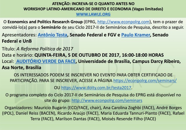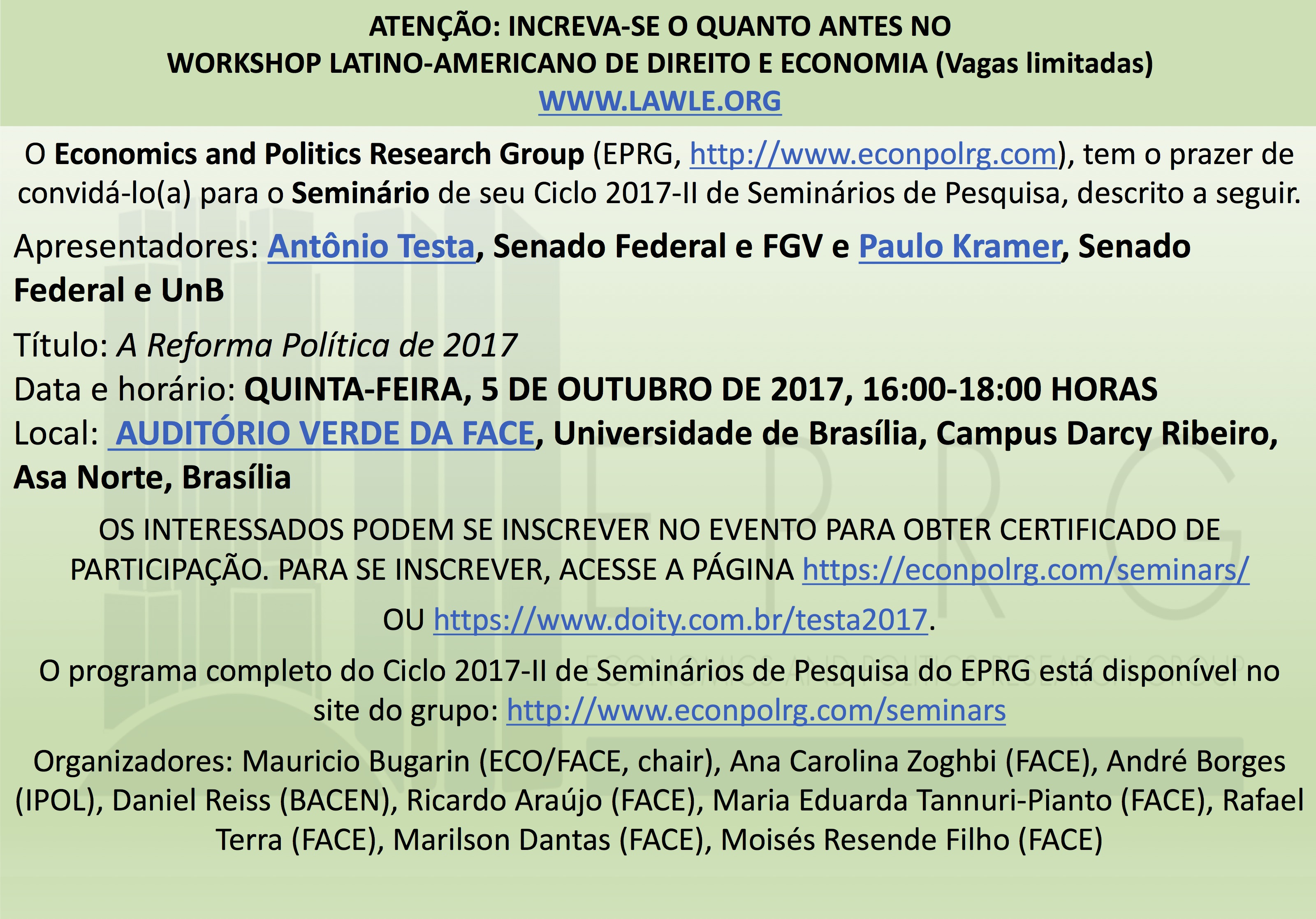 O Economics and Politics Research Group (EPRG, http://www.econpolrg.com), tem o prazer de convidá-lo(a) para o Seminário de seu Ciclo 2017-II de Seminários de Pesquisa, descrito a seguir.