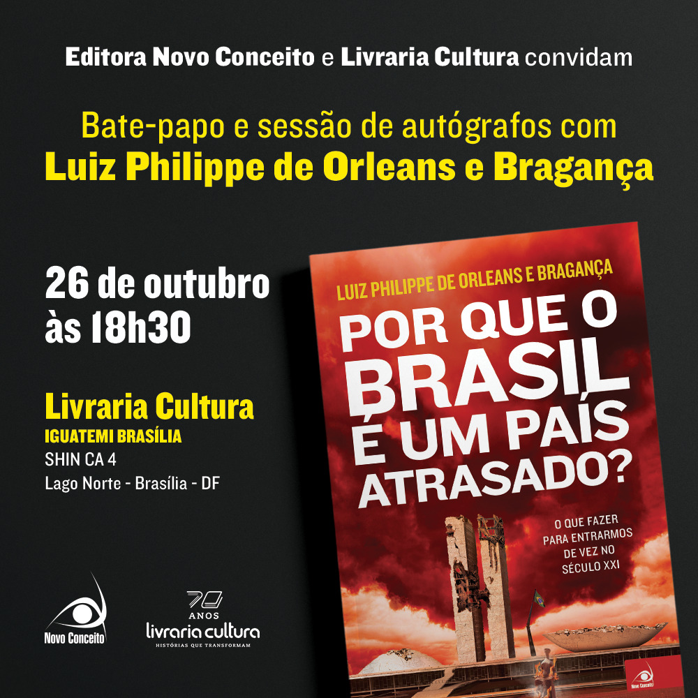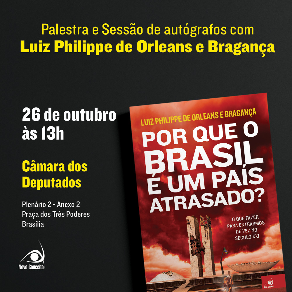 Dia 26/10, duplo lançamento do livro Por que o Brasil é um país atrasado? de Luiz Philippe de Orleans e Bragança na Câmara dos Deputados e na Livraria Cultura Iguatemi