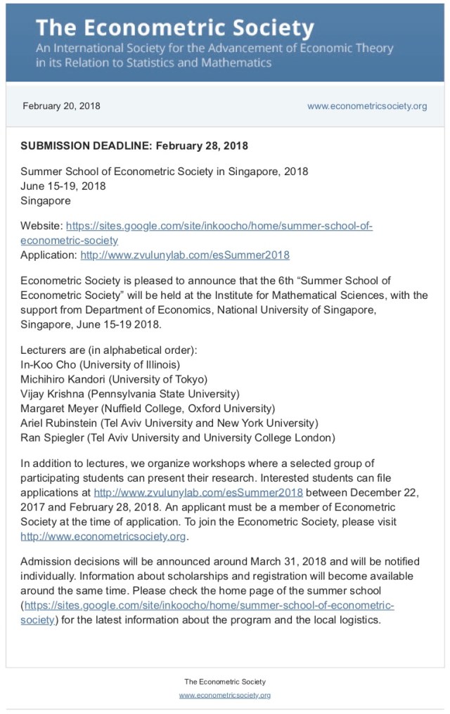 OPPORTUNITIES FOR STUDENTS!! Summer School of the Econometric Society in Singapore