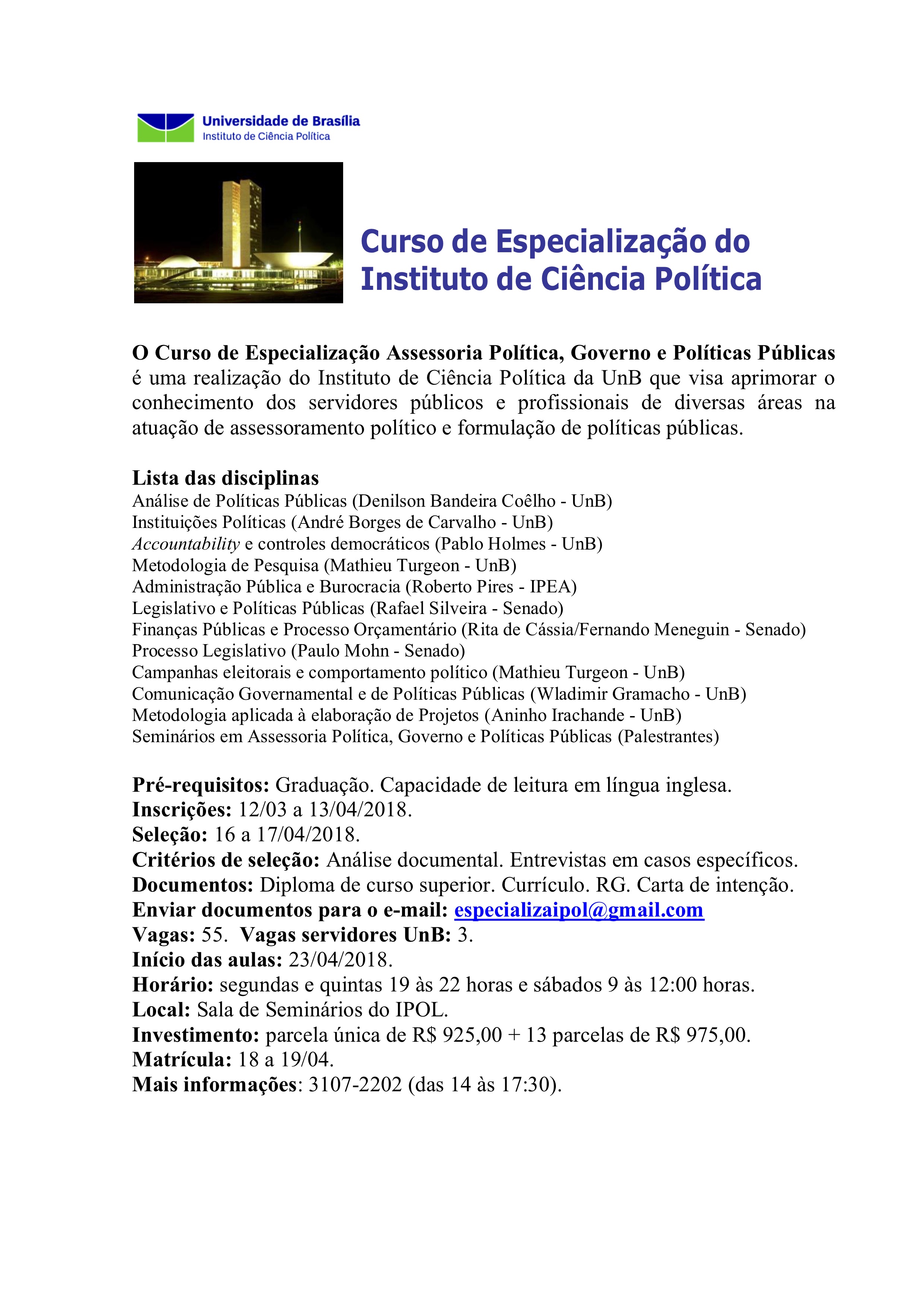 Oportunidade: Curso de Especialização IPOL/UnB: Somente até 13/4/2018