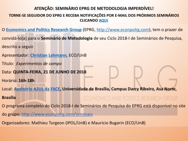 O Economics and Politics Research Group (EPRG, http://www.econpolrg.com), tem o prazer de convidá-lo(a) para o Seminário de Metodologia de seu Ciclo 2018-I de Seminários de Pesquisa, descrito a seguir.