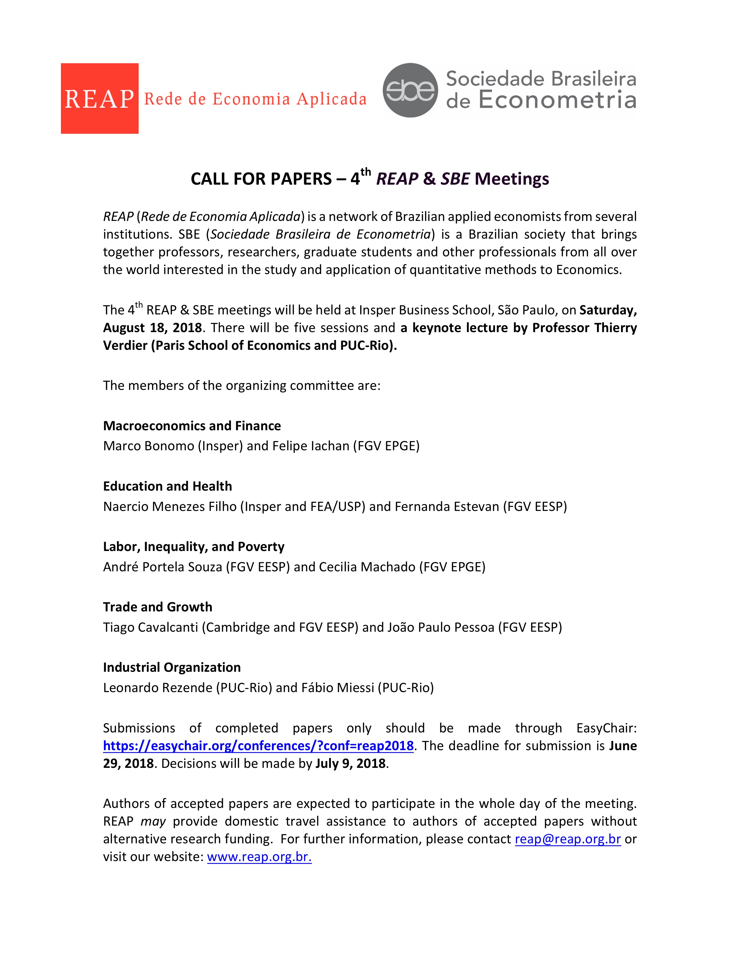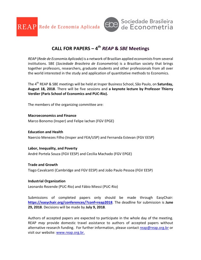 Segue em anexo a Chamada de Trabalhos para o 4th REAP & SBE Meetings que será realizado no Insper em São Paulo no sábado 18 de agosto.