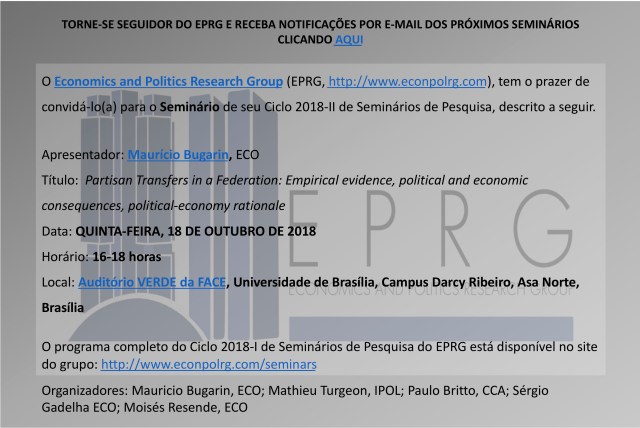 O Economics and Politics Research Group (EPRG, http://www.econpolrg.com), tem o prazer de convidá-lo(a) para o Seminário de seu Ciclo 2018-II de Seminários de Pesquisa, descrito a seguir.