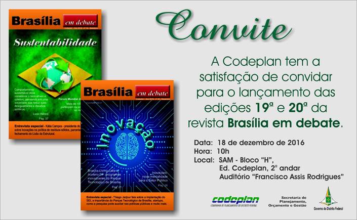 Hoje, dia 18 de dezembro (terça-feira), às 10h00 no Auditório da Codeplan.