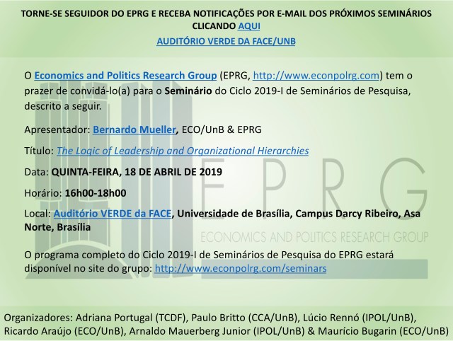 O Economics and Politics Research Group (EPRG, http://www.econpolrg.com) tem o prazer de convidá-lo(a) para o Seminário do Ciclo 2019-I de Seminários de Pesquisa, descrito a seguir.