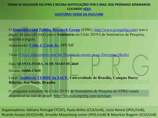 O Economics and Politics Research Group (EPRG, http://www.econpolrg.com) tem o prazer de convidá-lo(a) para o Seminário do Ciclo 2019-I de Seminários de Pesquisa, descrito a seguir.