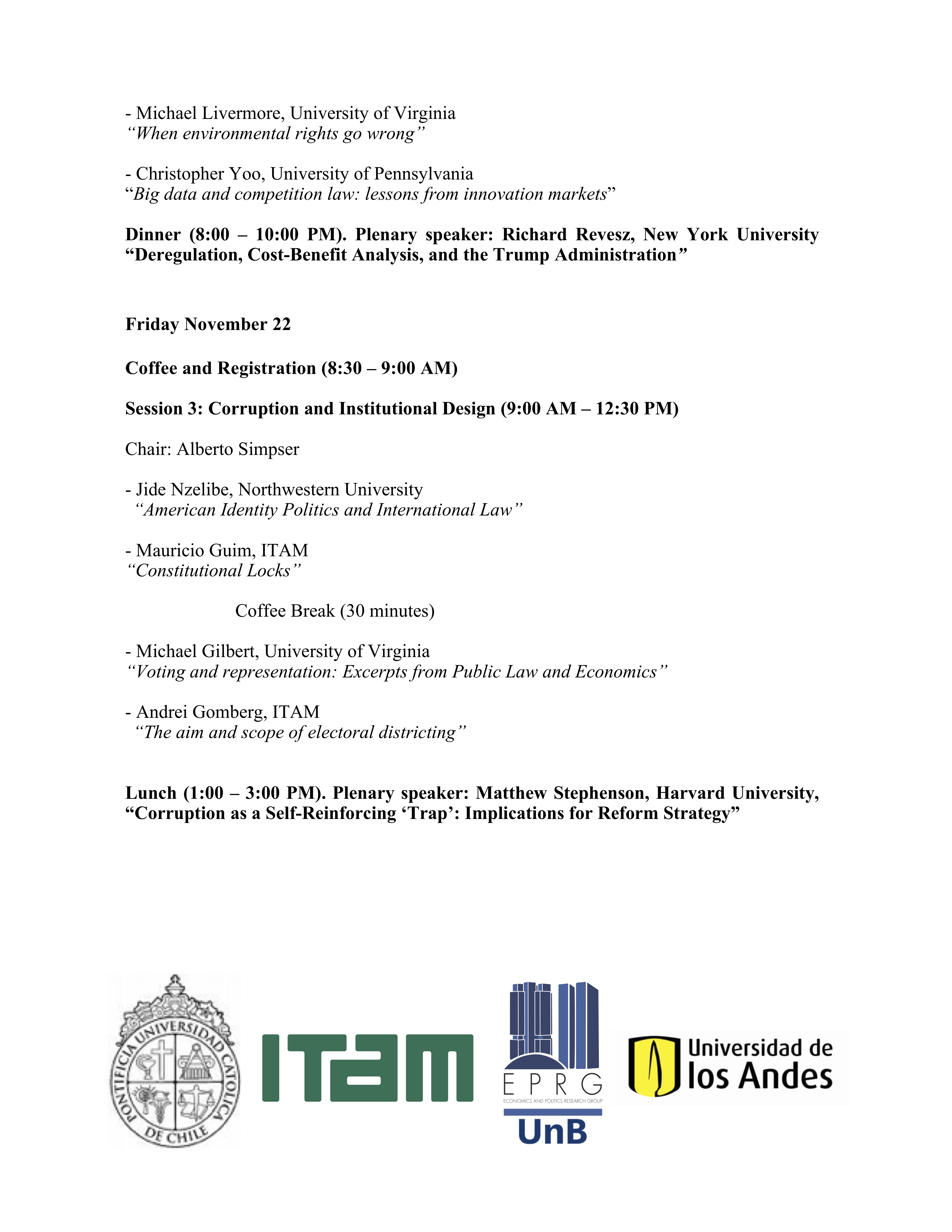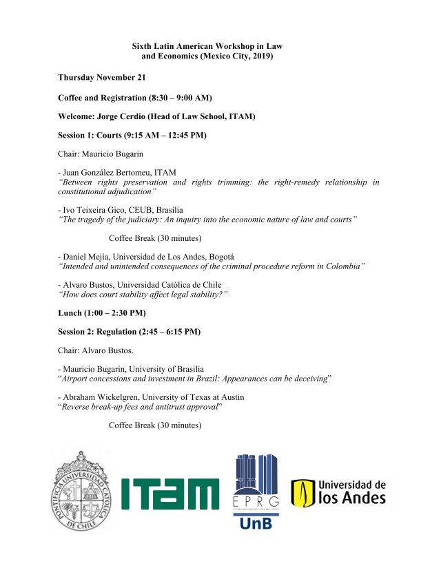 O Economics and Politics Research Group é uma das instituições organizadoras do Latin American Workshop in Law and Economics, LAWLE, cujo sexto encontro anual será realizado na cidade do México nos dias 21 e 22 de novembro de 2019. Vejam abaixo o programa do evento, ou consultem diretamente o site: