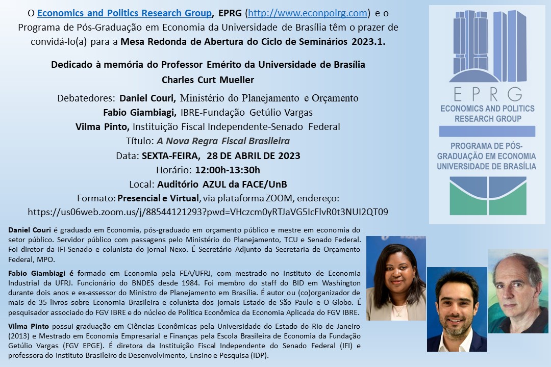 O Economics and Politics ResearchGroup, EPRG (http://www.econpolrg.com) e o Programa de Pós-Graduação do ECO/UNB têm o prazer de convidá-lo(a) para Mesa Redonda de Abertura do Ciclo de Seminários 2023.I: