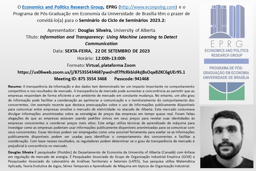 Douglas Silveira É pesquisador (Postdoc) do Departamento de Economia da University of Alberta (Canadá) com ênfase em regulação de mercado de energia. É Pesquisador Associado do Grupo de Organização Industrial Empírica (GOIE) e Pesquisador Associado do Laboratório de Análises Territoriais e Setoriais (LATES). Sua pesquisa utiliza Matemática Aplicada, Teoria Evolutiva de Jogos, Séries Temporais e Aprendizado de Máquina em tópicos de Organização Industrial.