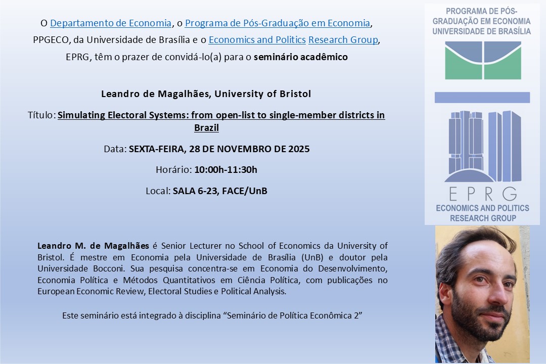 O Departamento de Economia, o Programa de Pós-Graduação em Economia, PPGECO, da Universidade de Brasília e o Economics and Politics Research Group, EPRG, têm o prazer de convidá-lo(a) para o seminário acadêmico:
