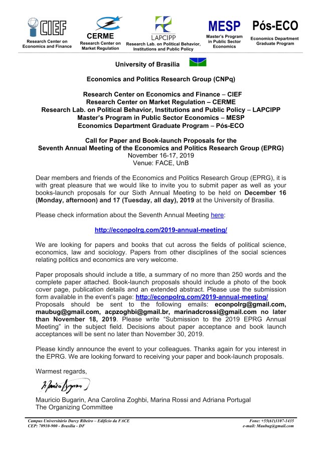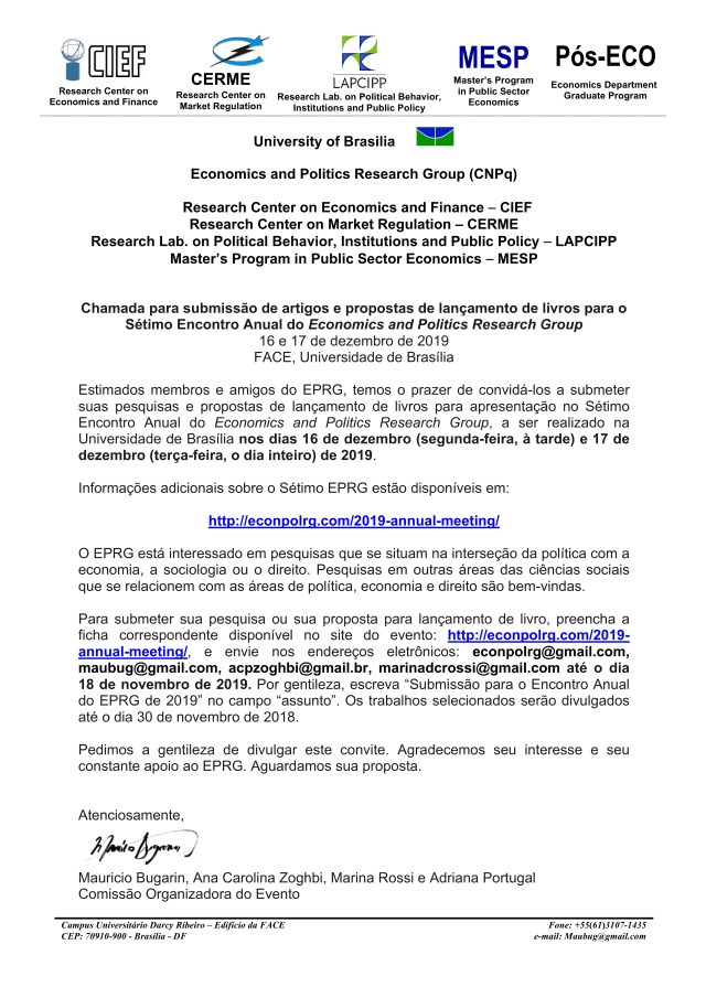 Seminário EPRG: CELSO COSTA JUNIOR (SPE – Ministério da Economia), Sexta 18/10/2019, 12:00 FACE/UnB