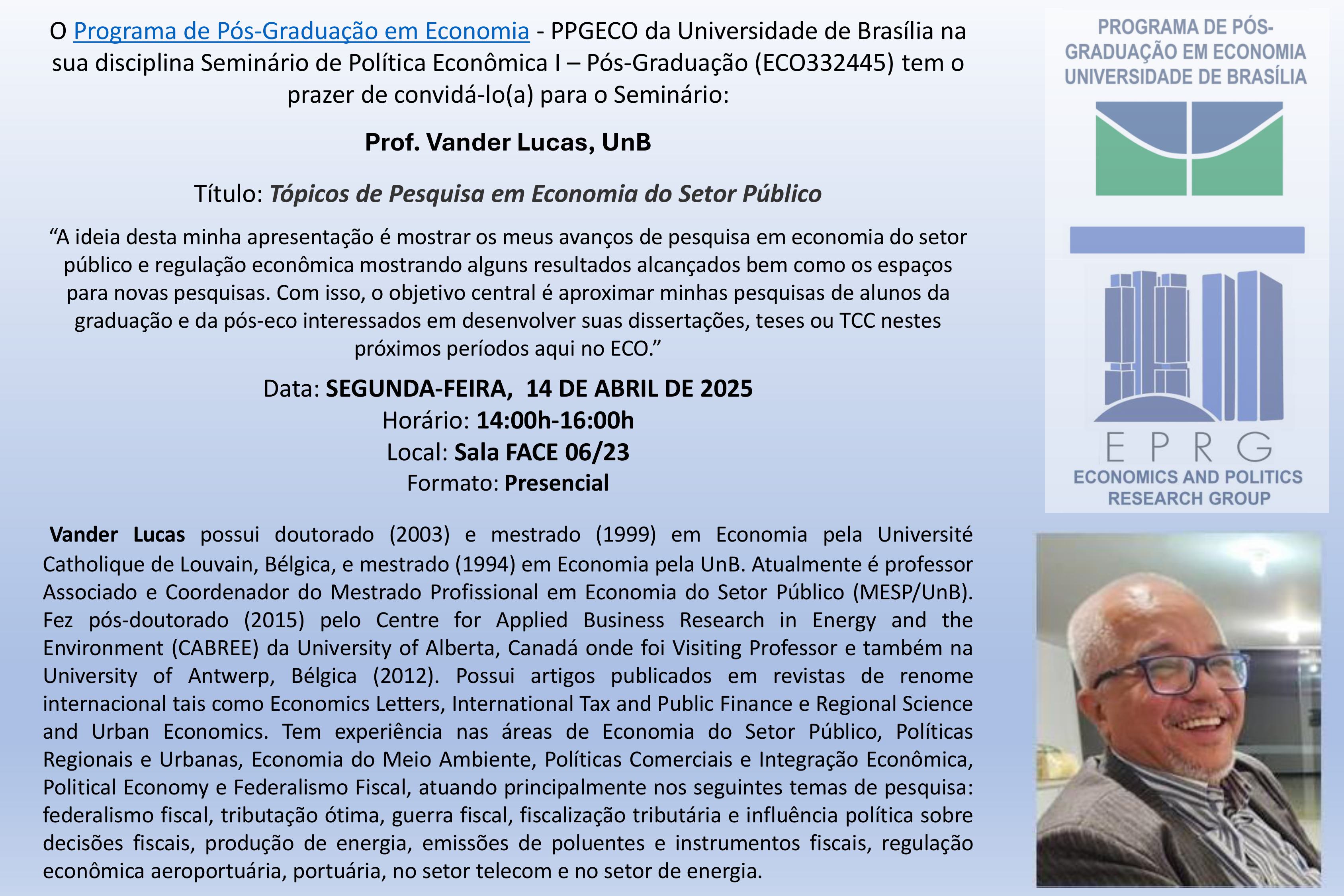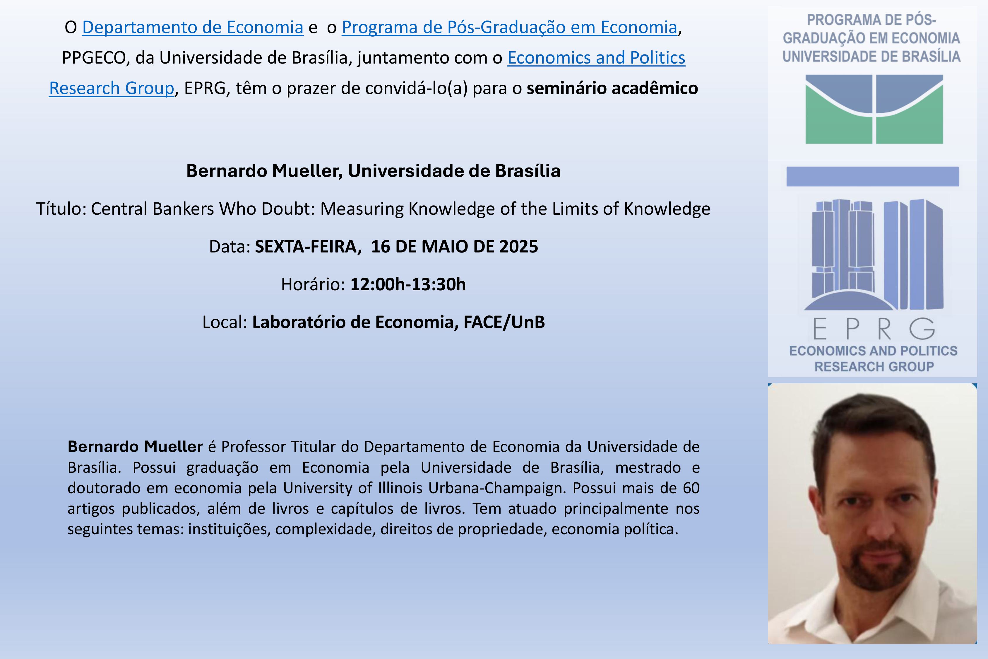 O Economics and Politics Research Group, EPRG (http://www.econpolrg.com) e o Programa de Pós-Graduação em Economia da Universidade de Brasília têm o prazer de convidá-lo(a) para o seminário: